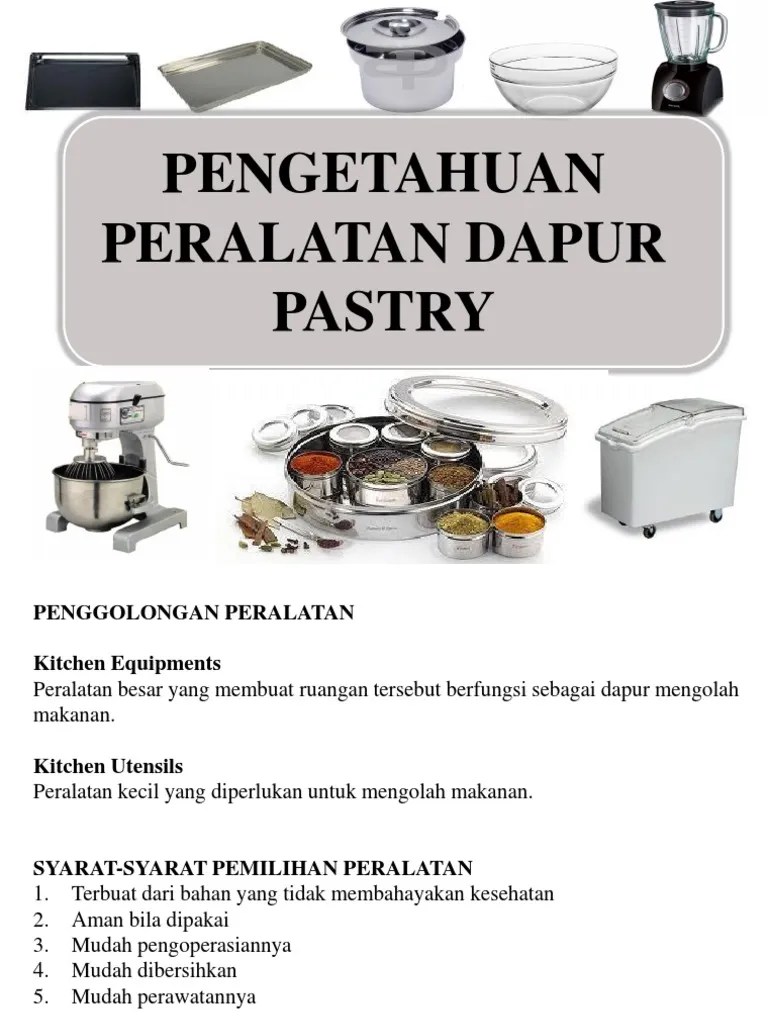 Berdasarkan fungsinya, kitchen equipment dibagi menjadi, a. 16) mandolin berfungsi untuk mengiris buah dan sayuran. Preparations equipment adalah peralatan yang digunakan untuk persiapan pengolahan makanan. Processing equipment adalah peralatan yang digunakan untuk memproses bahan makanan. Nama olshop yang islami, bagus, keren, lucu, hoki, unik, mudah diingat & yang belum dipakai cocok untuk nama toko online shop tas, hijab, pakaian, baju, gadget dan kosmetik.